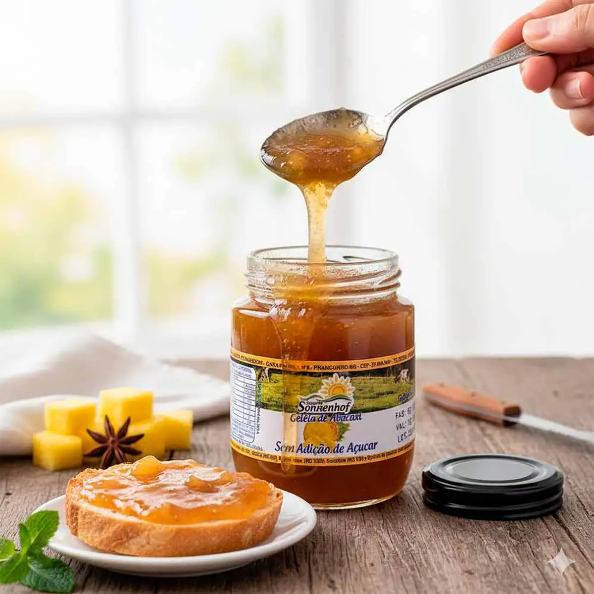 Frequentemente, a maioria das marcas de Geleia usam "Pectina" para baratear seus produtos. No entanto, esse ingrediente é artificial e dá um aspecto endurecido para as geleias, que deixa até difícil de espalhar. Mas com a nossa Geleia Diet de Abacaxi você não precisa se preocupar. Ela é bem leve e fácil de espalhar. Depois de experimentar, você nunca mais vai querer saber de outra marca.