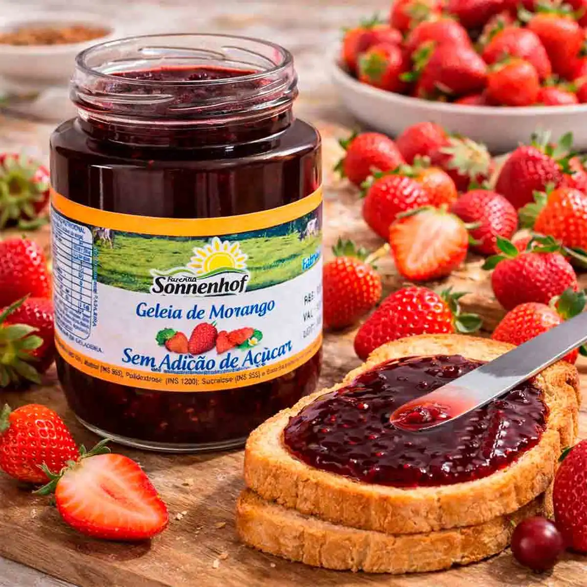 A Geleia Diet de Morango é feita artesanalmente, com frutas frescas e selecionadas diretamente pelos produtores da Fazenda Sonnenhof. É tão gostosa que tem até pedaços de morango.