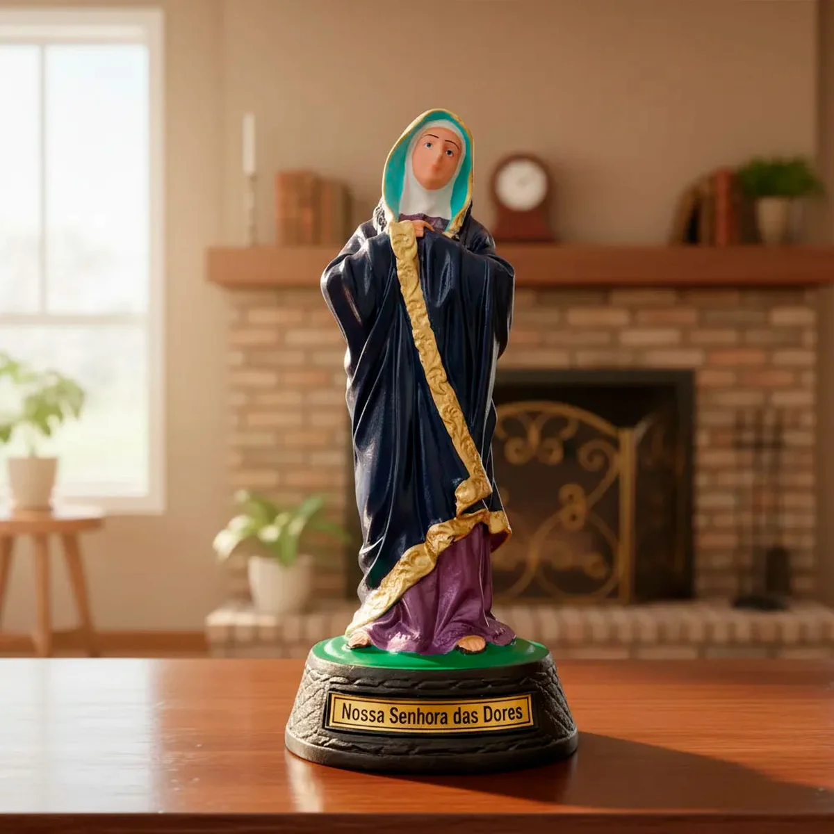 A Imagem de Nossa Senhora das Dores possui 20 cm de altura e é toda produzida e pintada a mão. É uma peça muito procurada para presente de Aniversários, Natal, padrinhos de casamento ou outras ocasiões especiais.