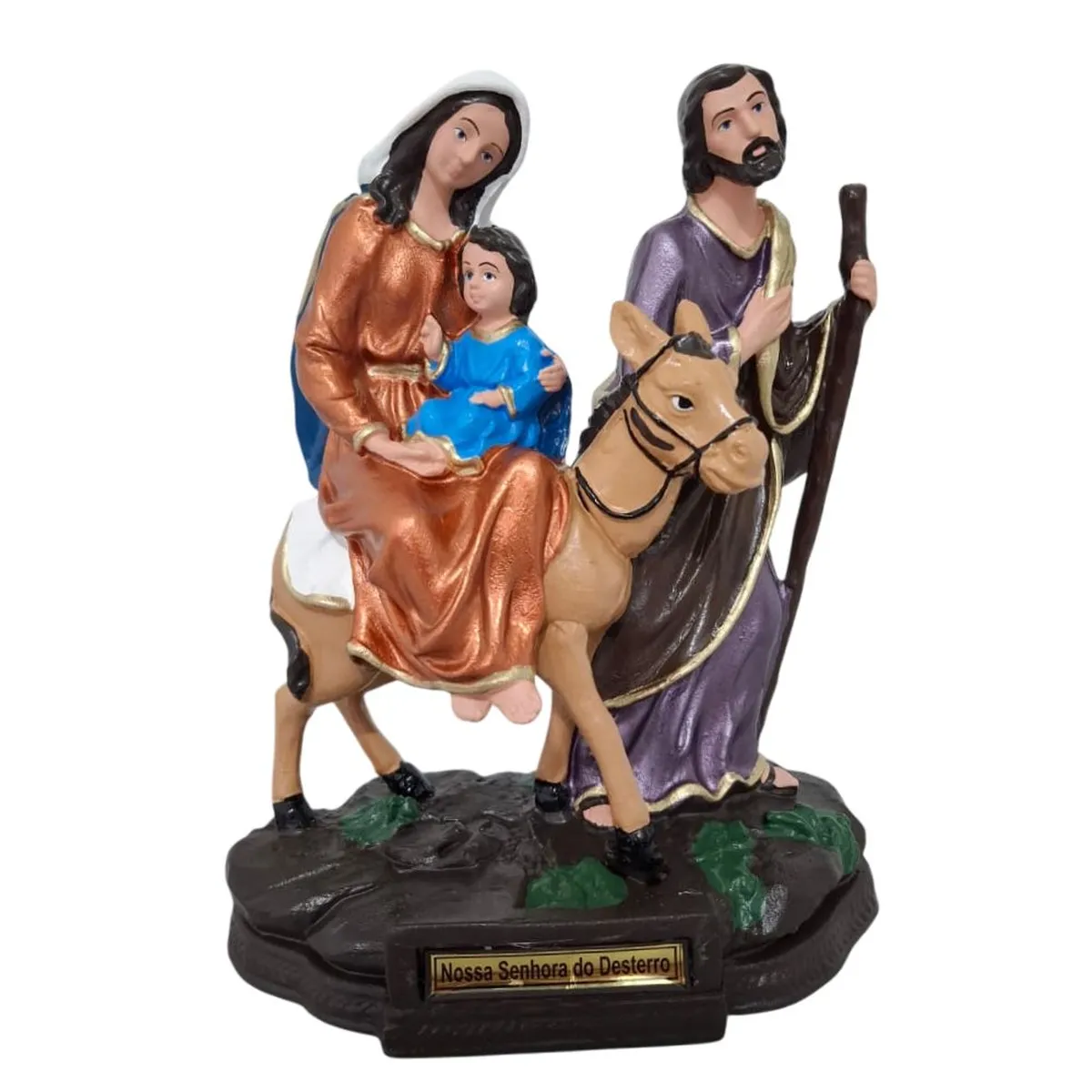 A Imagem de Nossa Senhora do Desterro de Borracha Inquebrável tem detalhes finamente esculpidos e pintados a mão, que nos convidam a buscar refúgio na intercessão da Sagrada Família em todos nossos momentos de necessidade.