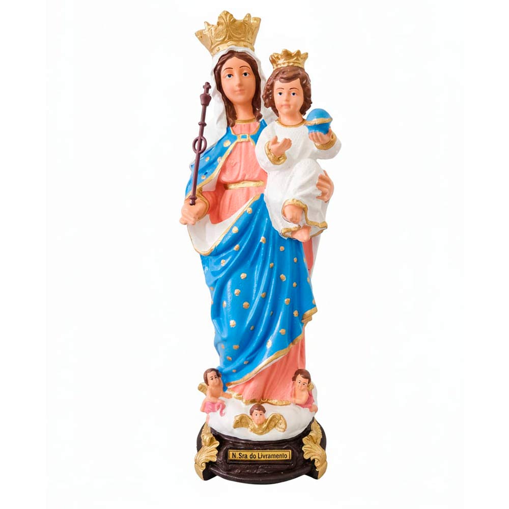 A Imagem de Nossa Senhora do Livramento em Borracha Inquebrável possui tamanho grande de 40 cm e representa a proteção materna de Maria. Ela está segurando o Menino Jesus, que segura o mundo e é o nosso Salvador e nos livra de todo o mal.