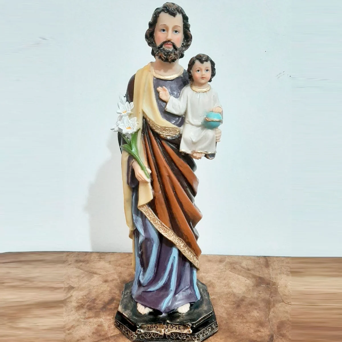A escultura é oca, toda feita em Resina, trabalhada e pintada a mão, rica em detalhes minimalistas. O material é muito mais durável e resistente se comparado às imagens de gesso. Ela pode ser exposta a agentes externos, como o sol e a poeira, sem desbotar e nem perder sua coloração original. Além disso, ela pode ser lavada que a tinta não sai.