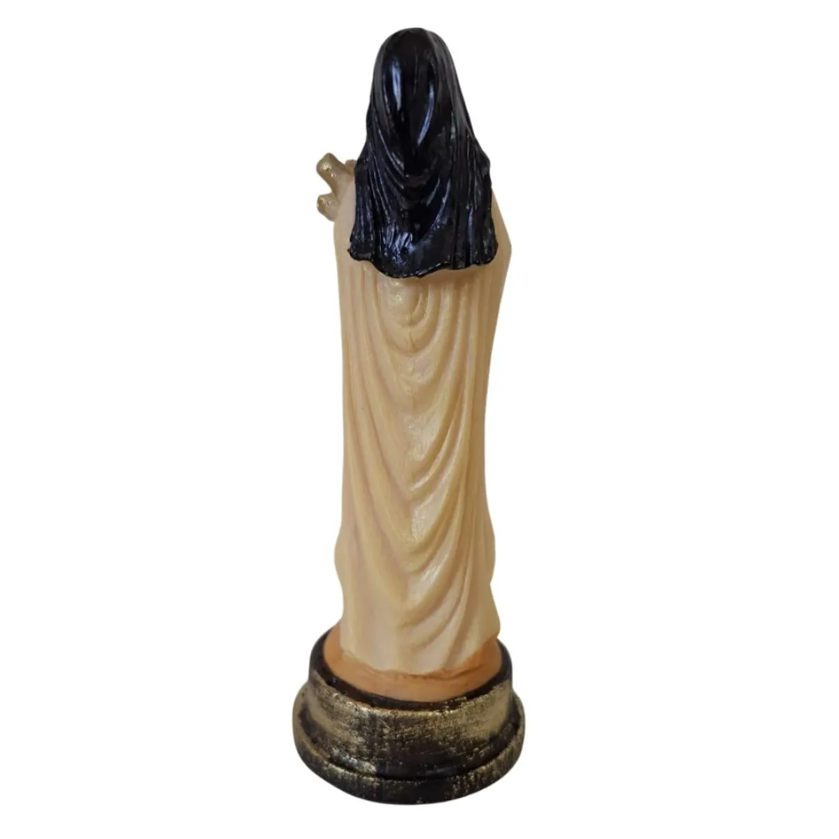 A Imagem de Santa Terezinha é toda produzida a mão em Resina. Esse material possui excelente qualidade e é muito mais durável e resistente se comparado às imagens de gesso. O gesso se esfarela com uma simples batidinha e desgasta com o passar do tempo. É comum que as imagens de gesso fiquem desfiguradas com o tempo e sem uma parte do nariz. Isso jamais vai acontecer com a imagem de resina! A resina dura para sempre se for bem preservada.