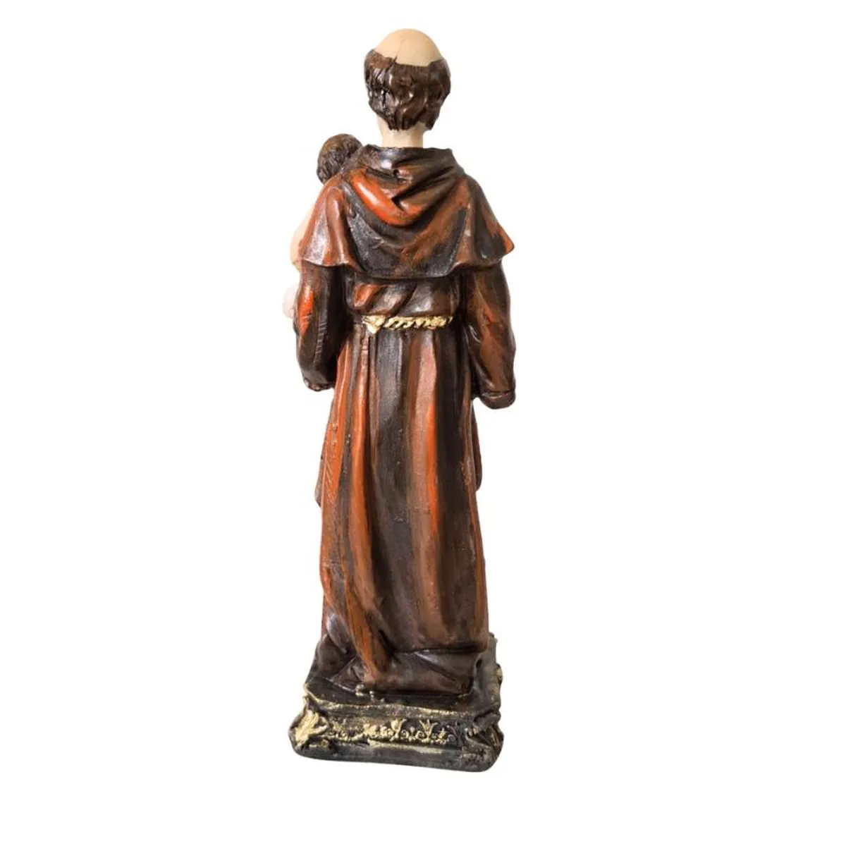 Imagem de Santo Antônio, o protetor das coisas perdidas, dos casamentos e dos pobres. É também conhecido como o Santo dos Milagres devido a grande quantidade que fez ainda em vida. É inteira trabalhada e pintada a mão, rica em pequenos detalhes que fazem toda a diferença na peça. Com 15 cm de altura, é toda feita em Resina, material de resistente e de alta qualidade, muito melhor e mais durável se comparado às imagens de gesso. Ela pode ser exposta a agentes externos, como o sol e a poeira, sem desbotar e nem perder sua coloração original. Além disso, ela pode ser lavada que a tinta não sai.