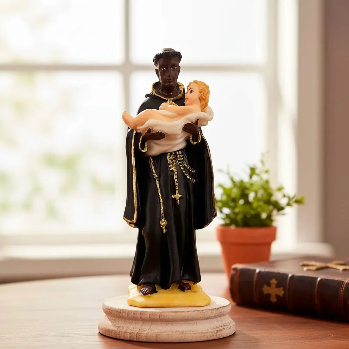 Imagem de São Benedito, o Santo Protetor da Cozinha, contra a fome e a falta de alimentos, sendo uma escultura inteira trabalhada e pintada a mão, com 15 cm de altura.