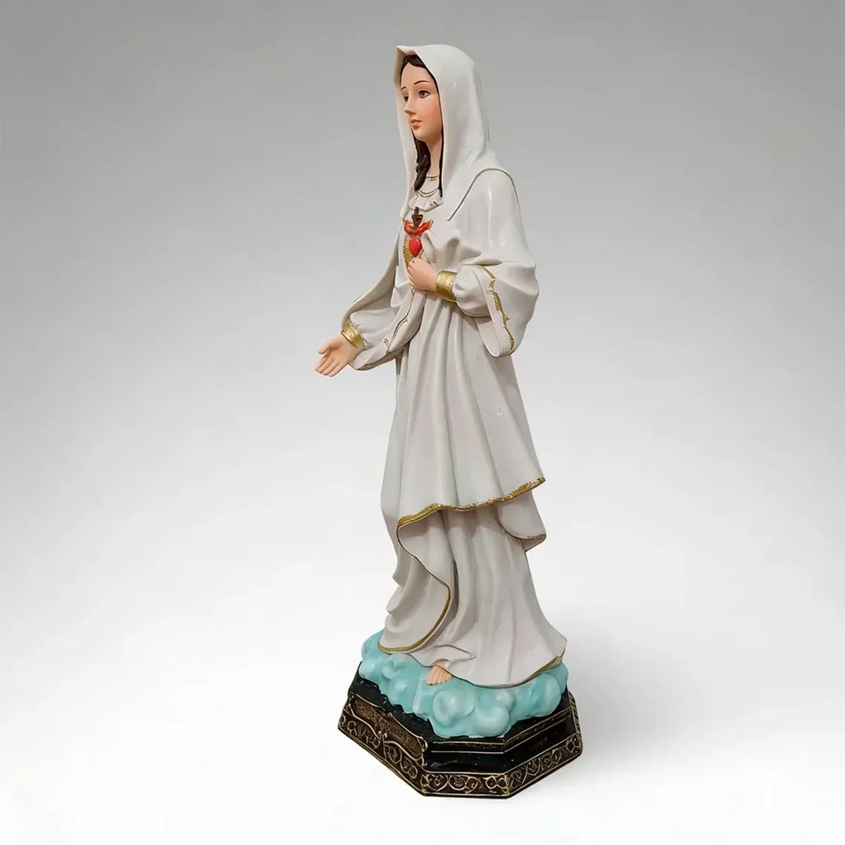 Rica em pequenos detalhes, é feita em Resina, material resistente, de alta qualidade e durabilidade. Muito superior se comparado às imagens de gesso. Pode ser exposta a agentes externos, como o sol e a poeira, sem desbotar e nem perder sua coloração original. Além disso, pode ser lavada que a tinta não sai.