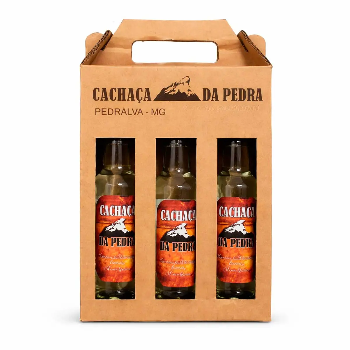 1 cachaça envelhecida em Barril de Bálsamo + 1 Envelhecida em Barril de Castanheira + 1 Envelhecida em Barril de Jequitibá Rosa. Todas com 275 ml cada. Inclui caixa de presente personalizada com a marca Cachaça da Pedra, conforme foto.